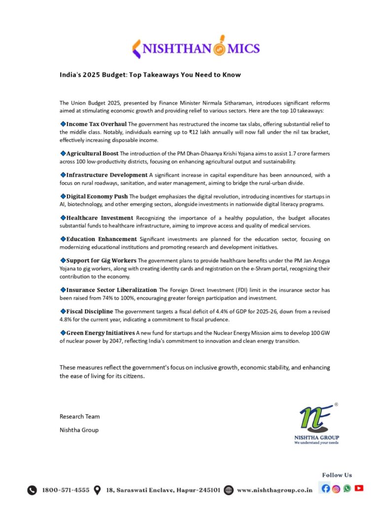 The Union Budget 2025, presented by Finance Minister Nirmala Sitharaman, introduces significant reforms aimed at stimulating economic growth and providing relief to various sectors. Here are the top 10 takeaways: